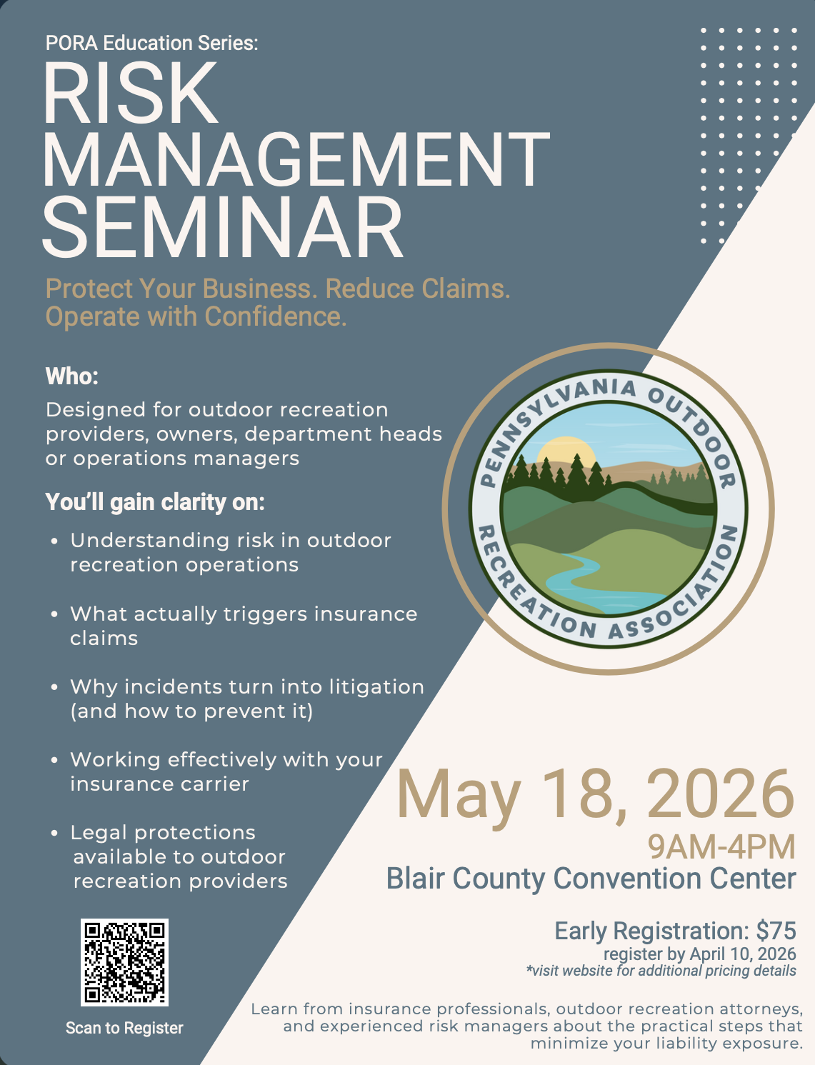 Join us on May 18, 2026, for the Pennsylvania Outdoor Recreation Association’s Risk Management Seminar, a dynamic day of learning, connection, and professional growth for Pennsylvania’s outdoor recreation community!